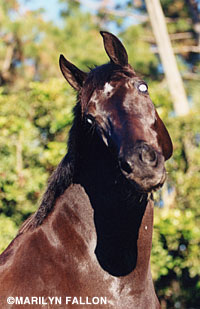 Valiant's troubles began when he stepped on a horseshoe nail. Despite prompt veterinary care, a raging bacterial infection developed in his bloodstream and other organs that nearly killed Valiant. Various powerful antibiotics including Penicillin were utilized to treat this overwhelming and potentially fatal infection. The bacteria in the blood also migrated to the inside of his eyes. The eye has weak defense mechanisms against infection. Aggressive therapy for this 'endophthalmitis' could not prevent the destruction of Valiants eyes and the subsequent blindness.